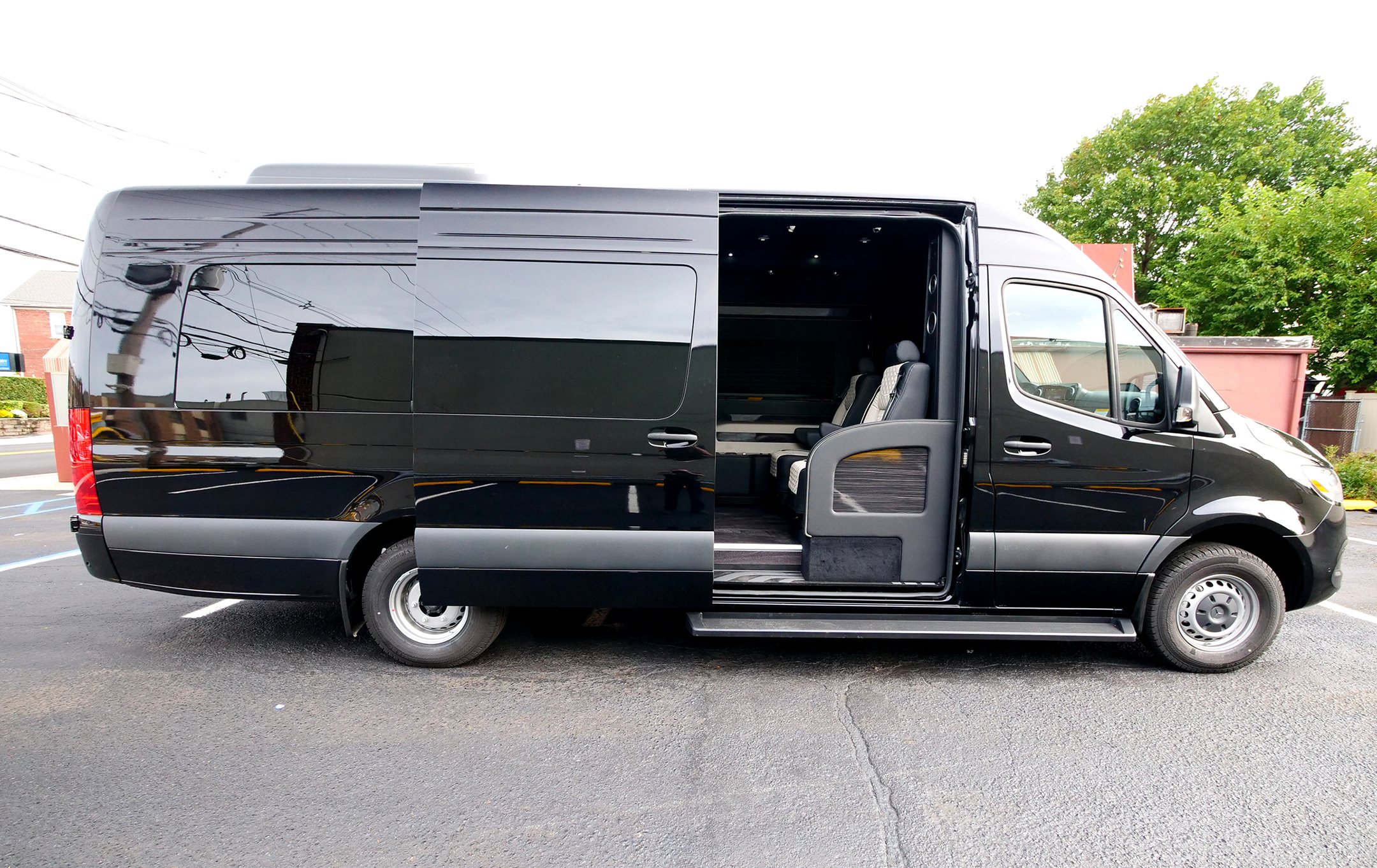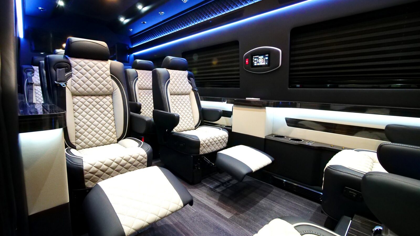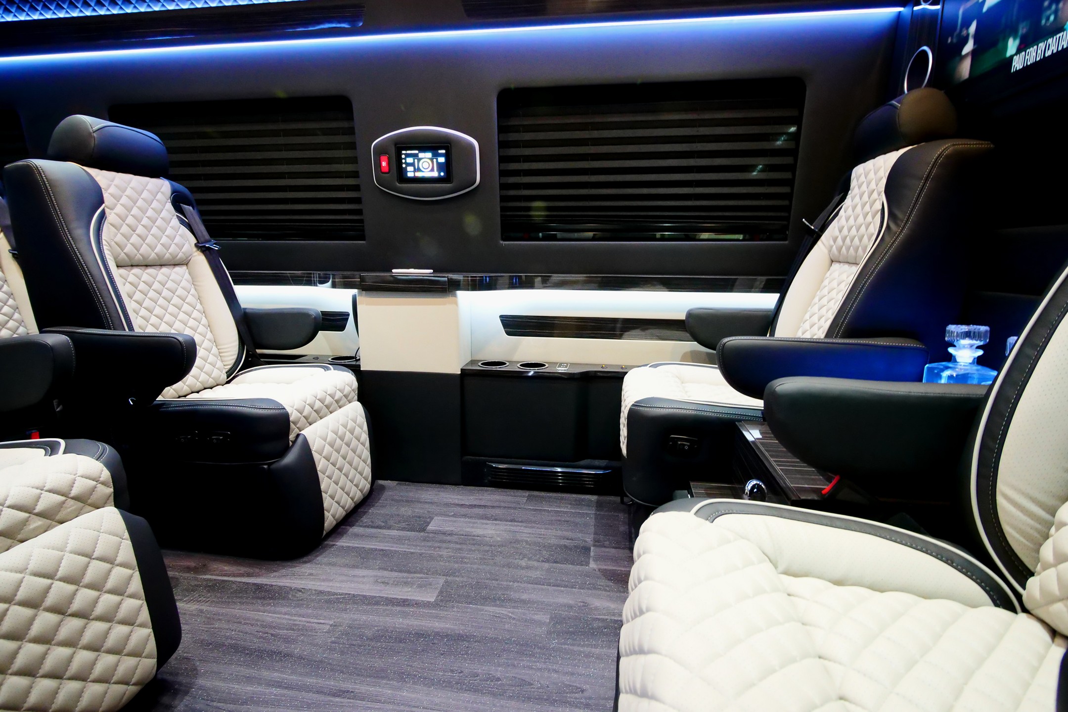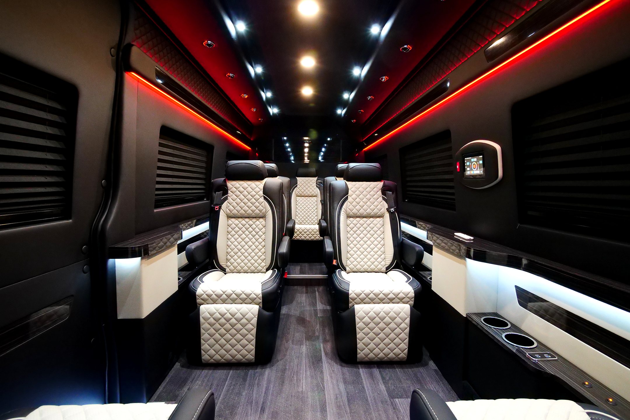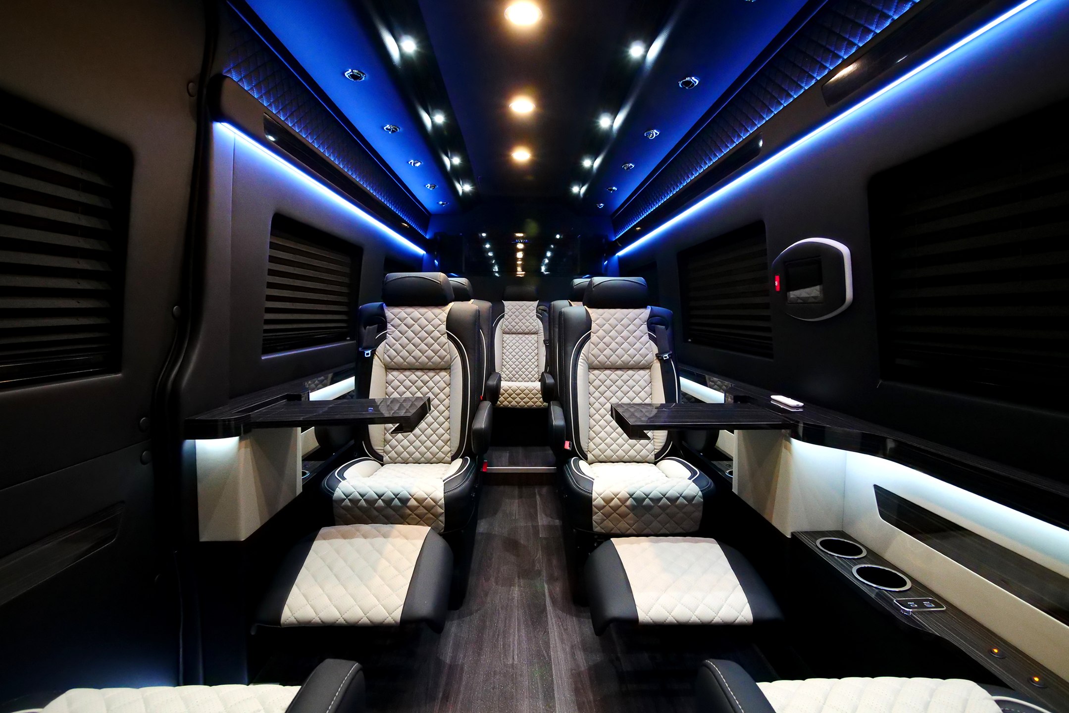 This Mercedes-Benz Sprinter Ambassador upfit seats nine passengers with a coordinated interior that blends functional design and purposeful amenities. The cabin features a black exterior and a dark interior with custom aviation-style finishes, nine captain chairs, and retractable tables, creating a comfortable environment for families, executives, or fleet use. Each seating position is arranged to support extended travel without sacrificing space or accessibility.