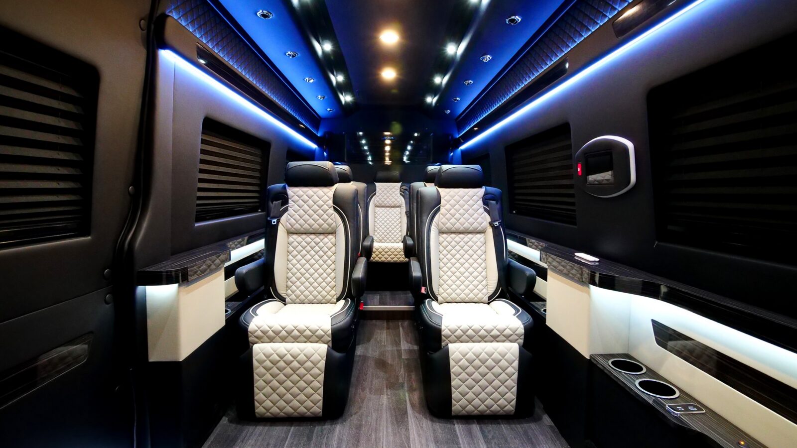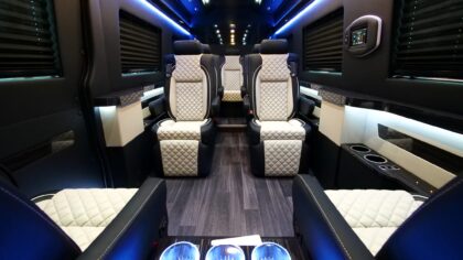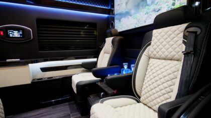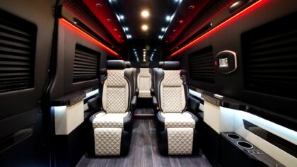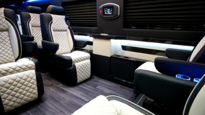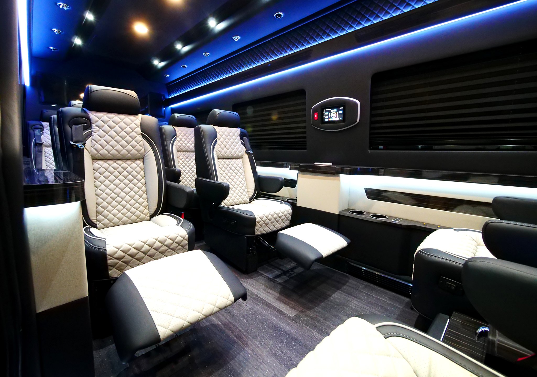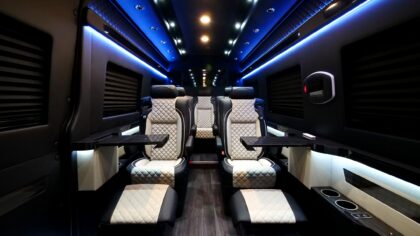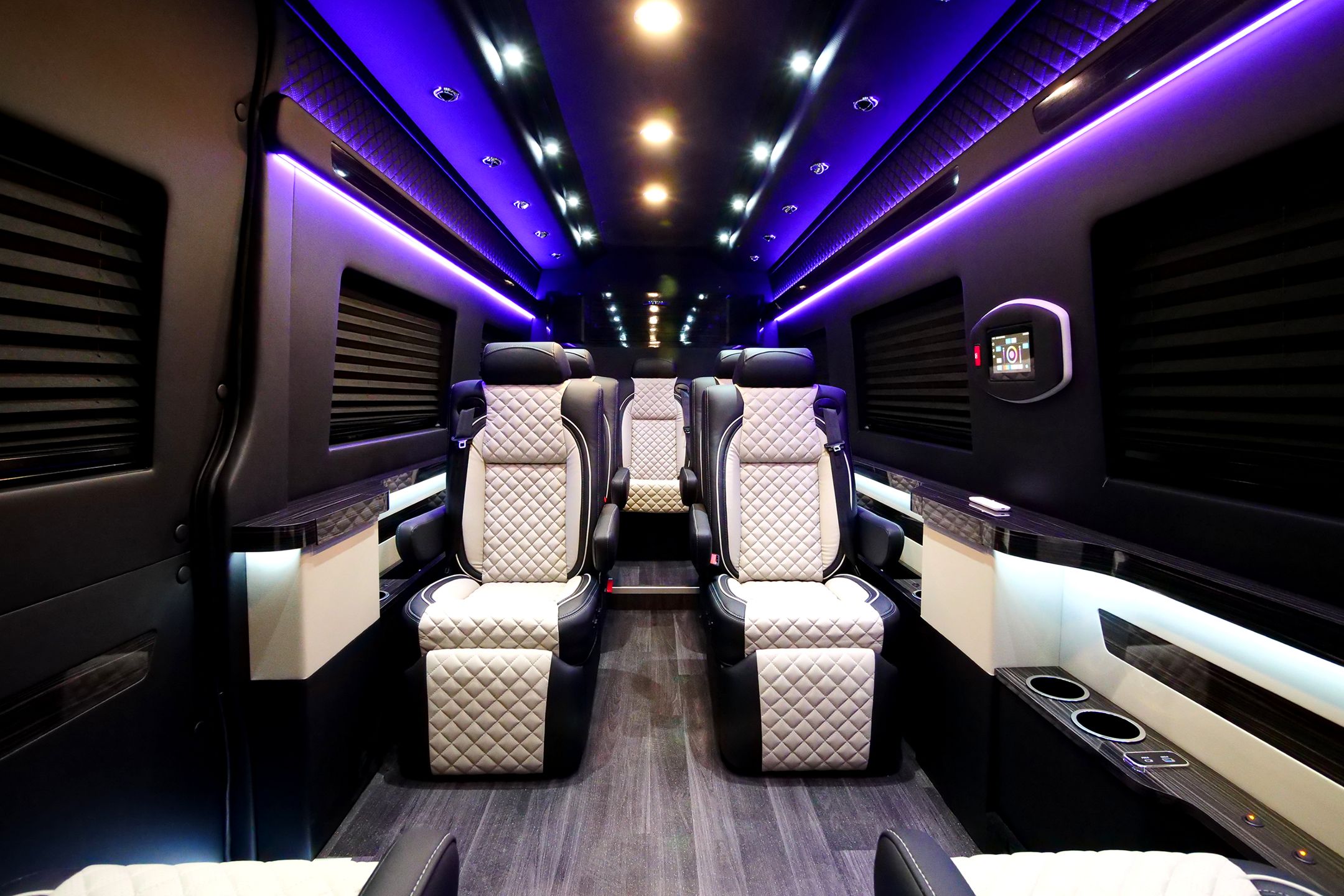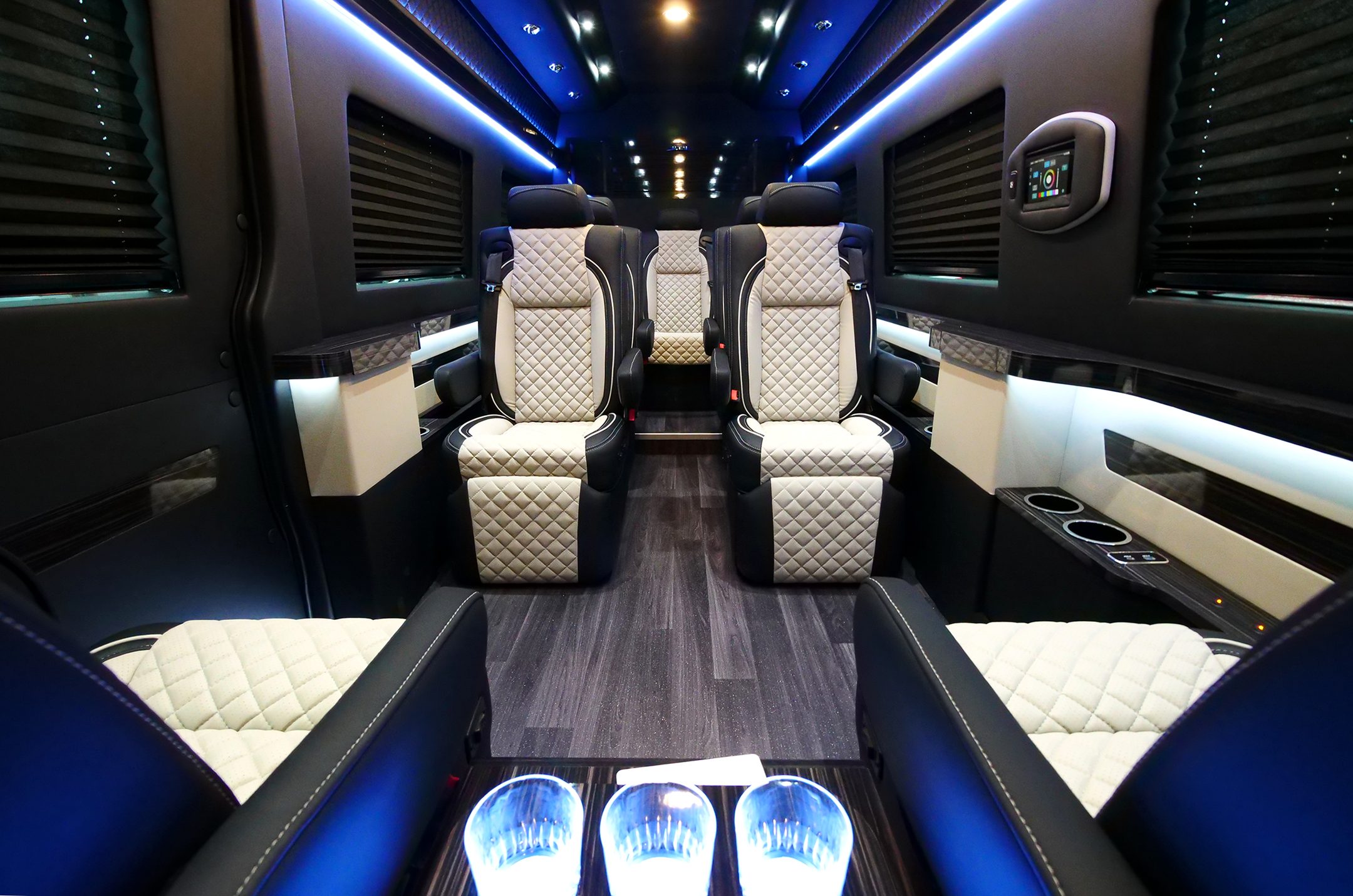 This Mercedes-Benz Sprinter Ambassador upfit seats nine passengers with a coordinated interior that blends functional design and purposeful amenities. The cabin features a black exterior and a dark interior with custom aviation-style finishes, nine captain chairs, and retractable tables, creating a comfortable environment for families, executives, or fleet use. Each seating position is arranged to support extended travel without sacrificing space or accessibility.