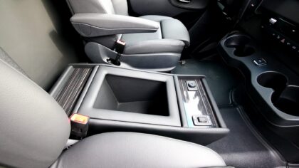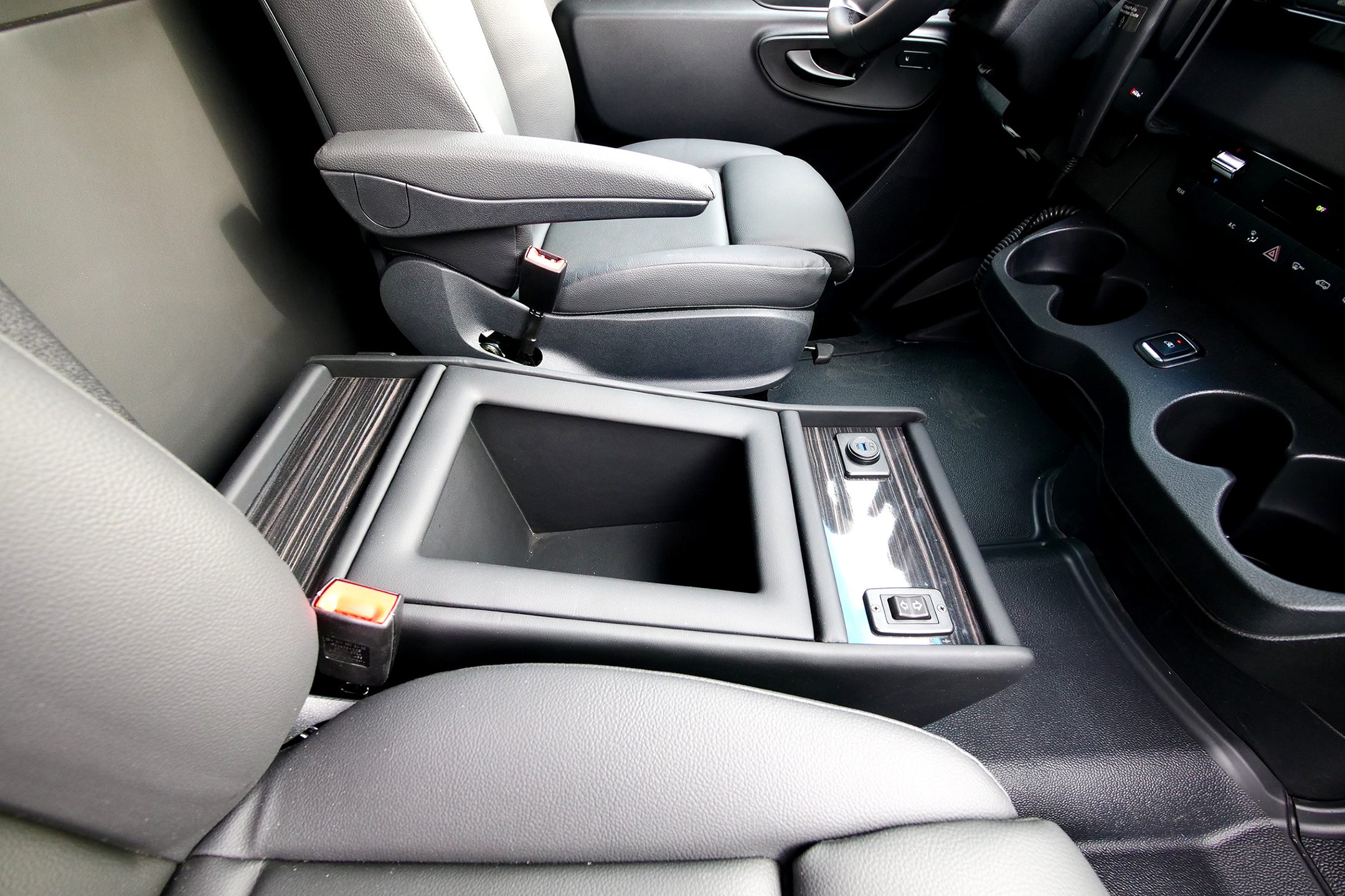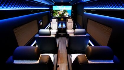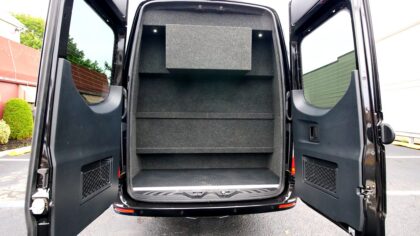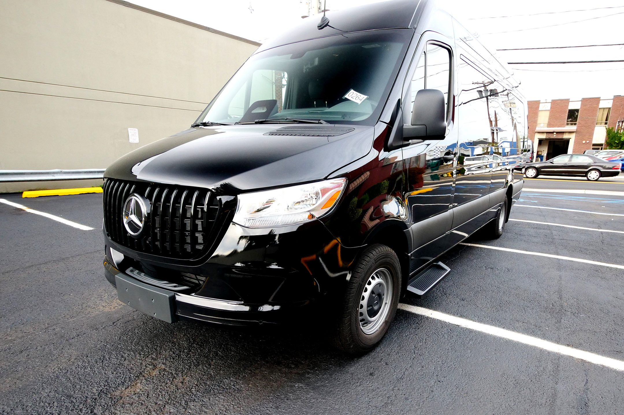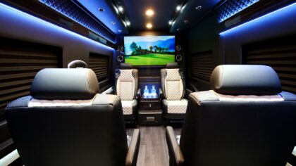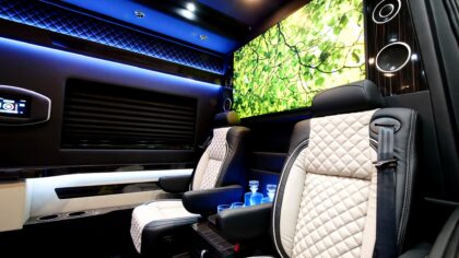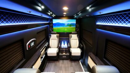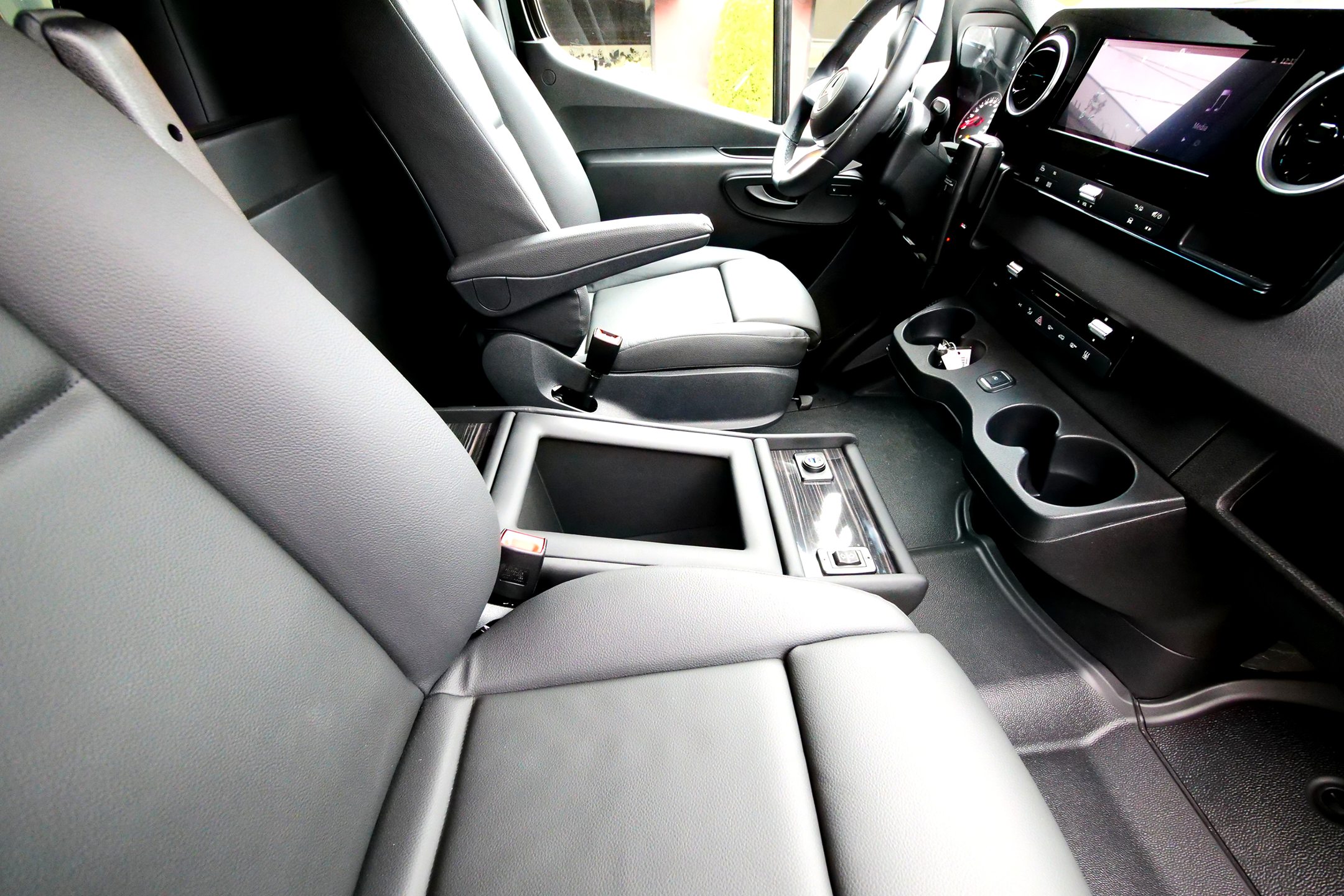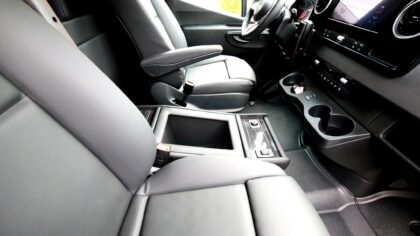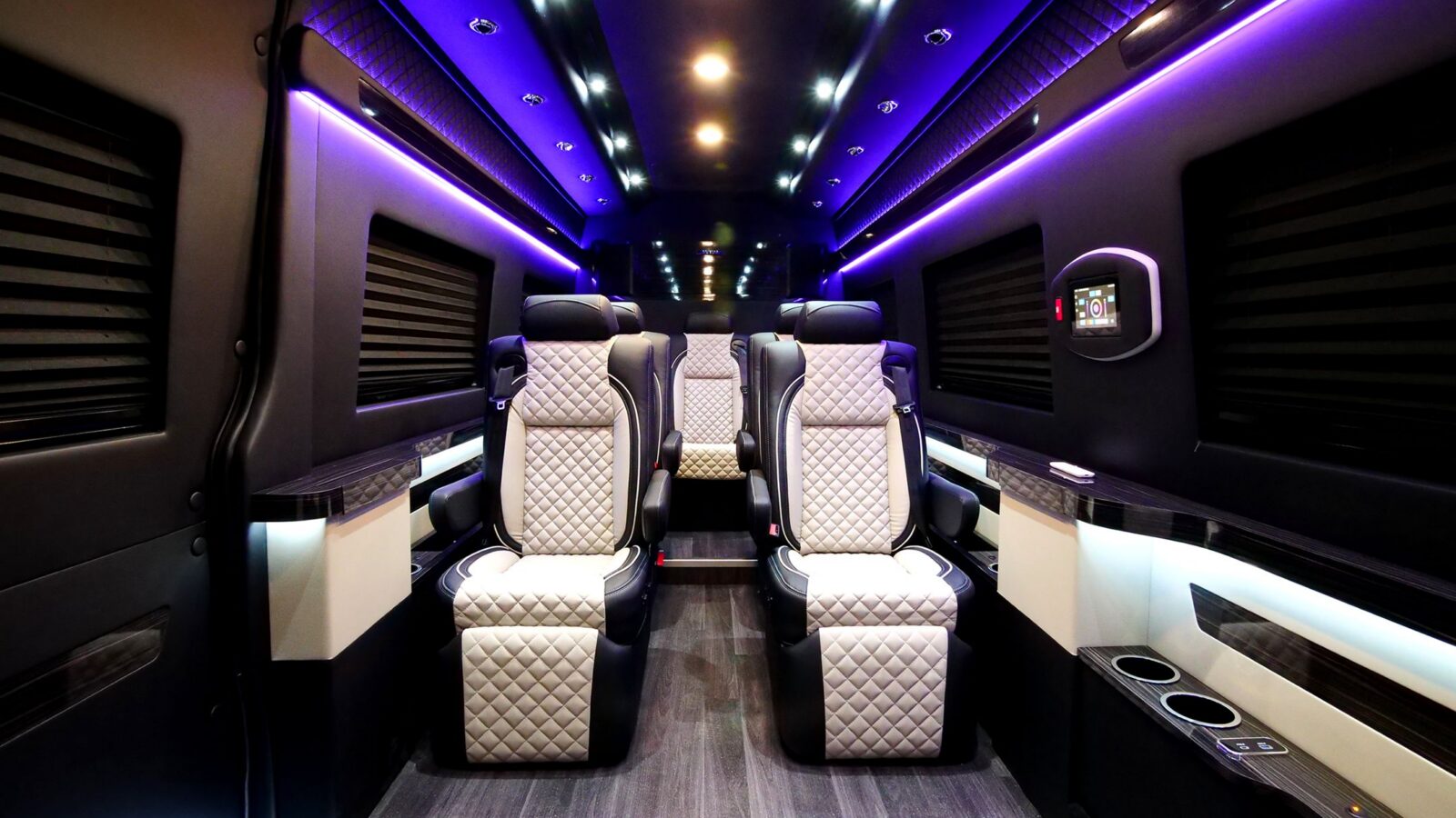 This Mercedes-Benz Sprinter Ambassador upfit seats nine passengers with a coordinated interior that blends functional design and purposeful amenities. The cabin features a black exterior and a dark interior with custom aviation-style finishes, nine captain chairs, and retractable tables, creating a comfortable environment for families, executives, or fleet use. Each seating position is arranged to support extended travel without sacrificing space or accessibility.