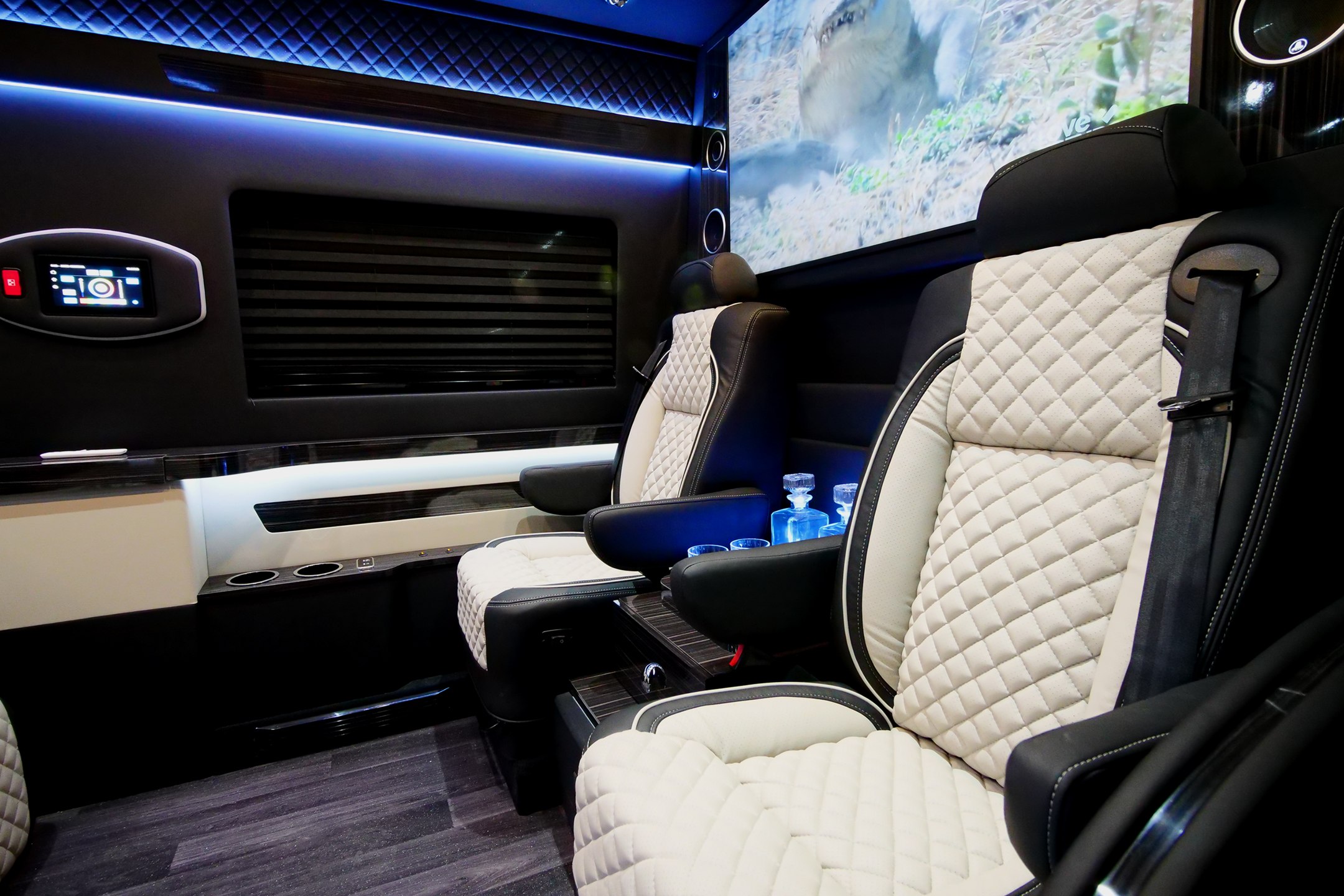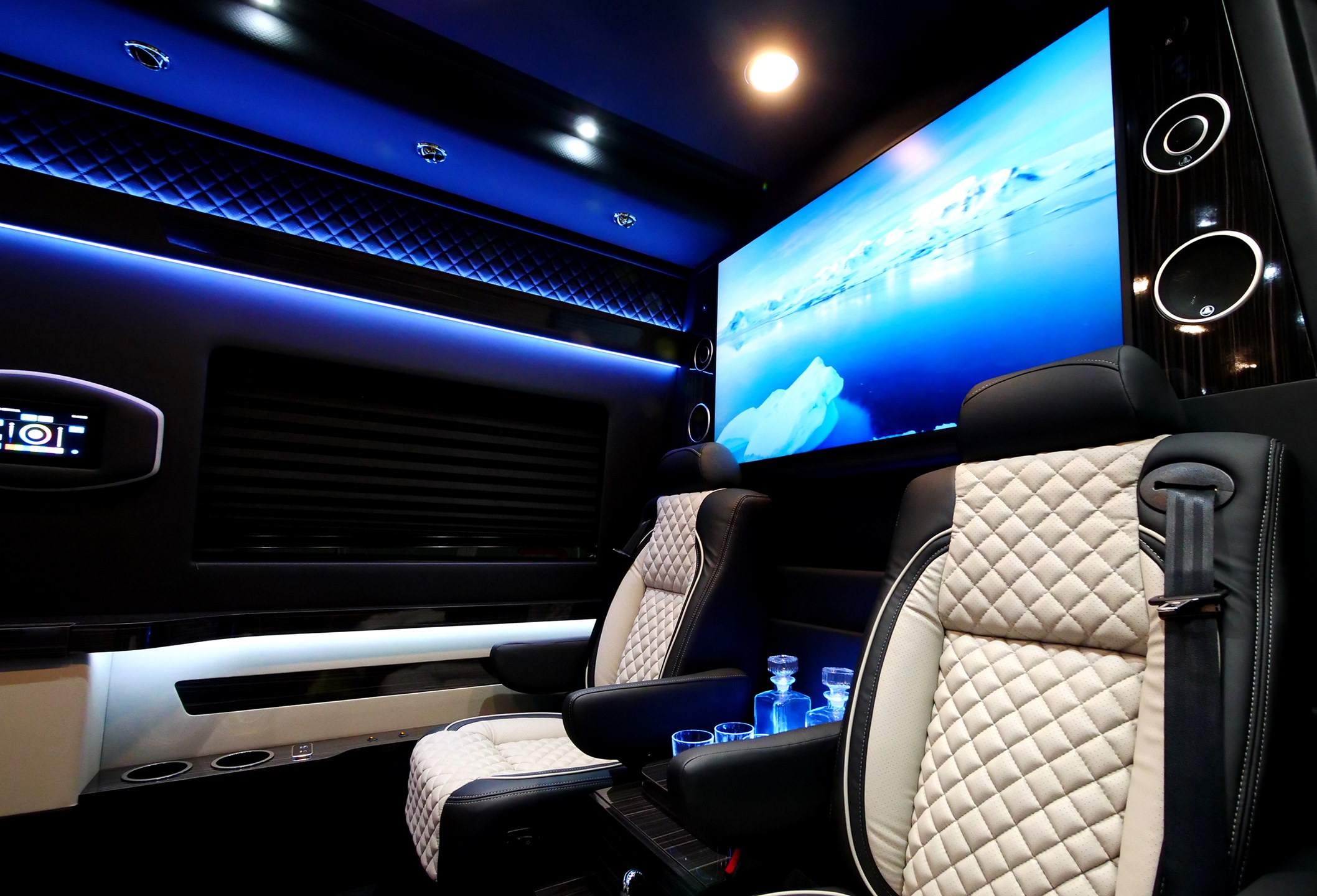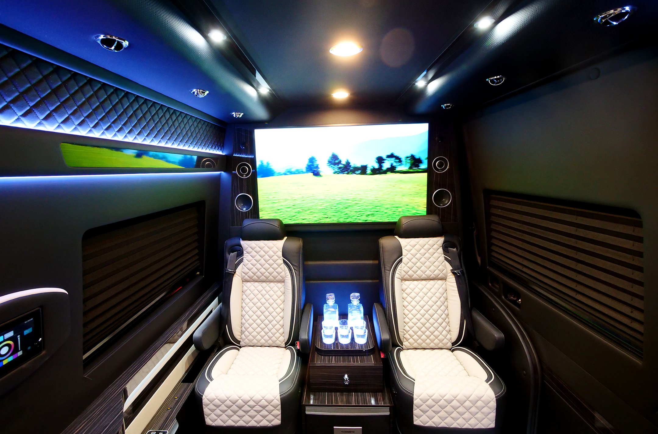 A motorized partition wall separates the passenger cabin from the driver’s area, housing a TV display, high-end surround sound system to create a private, self-contained environment. RGB LED lighting and a custom ceiling allow passengers to control cabin ambiance, while the integrated control panel makes it simple to adjust lighting, entertainment, and climate features from one interface. Front passenger console includes mini bar with decanter set and drawer refrigerator for keeping food and beverages chilled during transit.