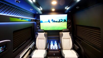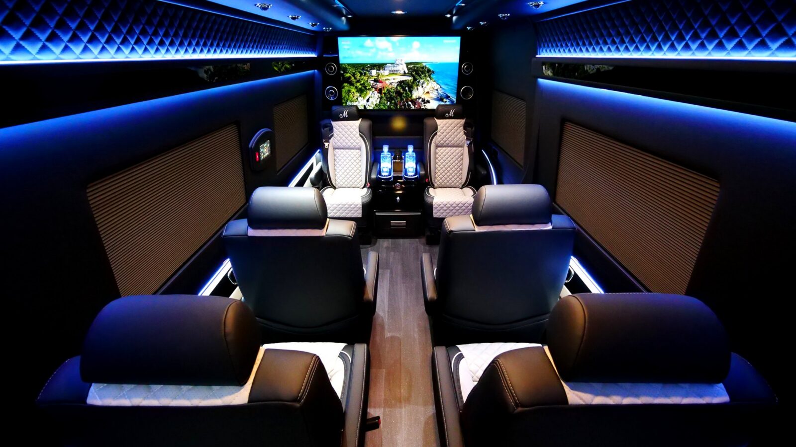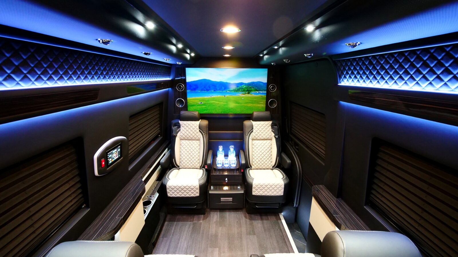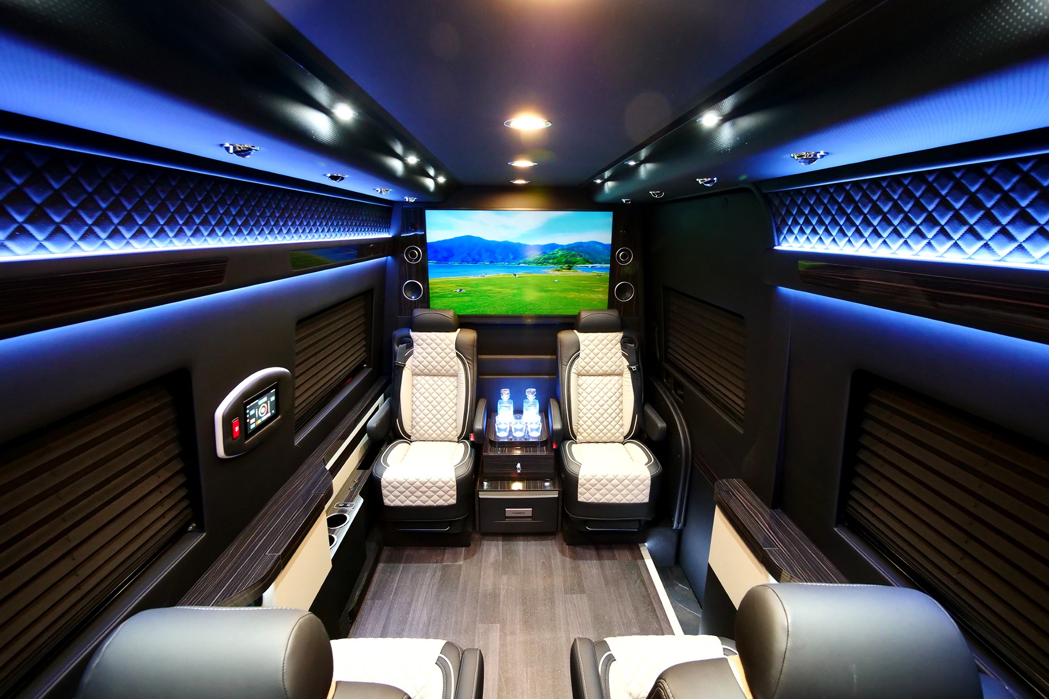 A motorized partition wall separates the passenger cabin from the driver’s area, housing a TV display, high-end surround sound system to create a private, self-contained environment. RGB LED lighting and a custom ceiling allow passengers to control cabin ambiance, while the integrated control panel makes it simple to adjust lighting, entertainment, and climate features from one interface. Front passenger console includes mini bar with decanter set and drawer refrigerator for keeping food and beverages chilled during transit.
