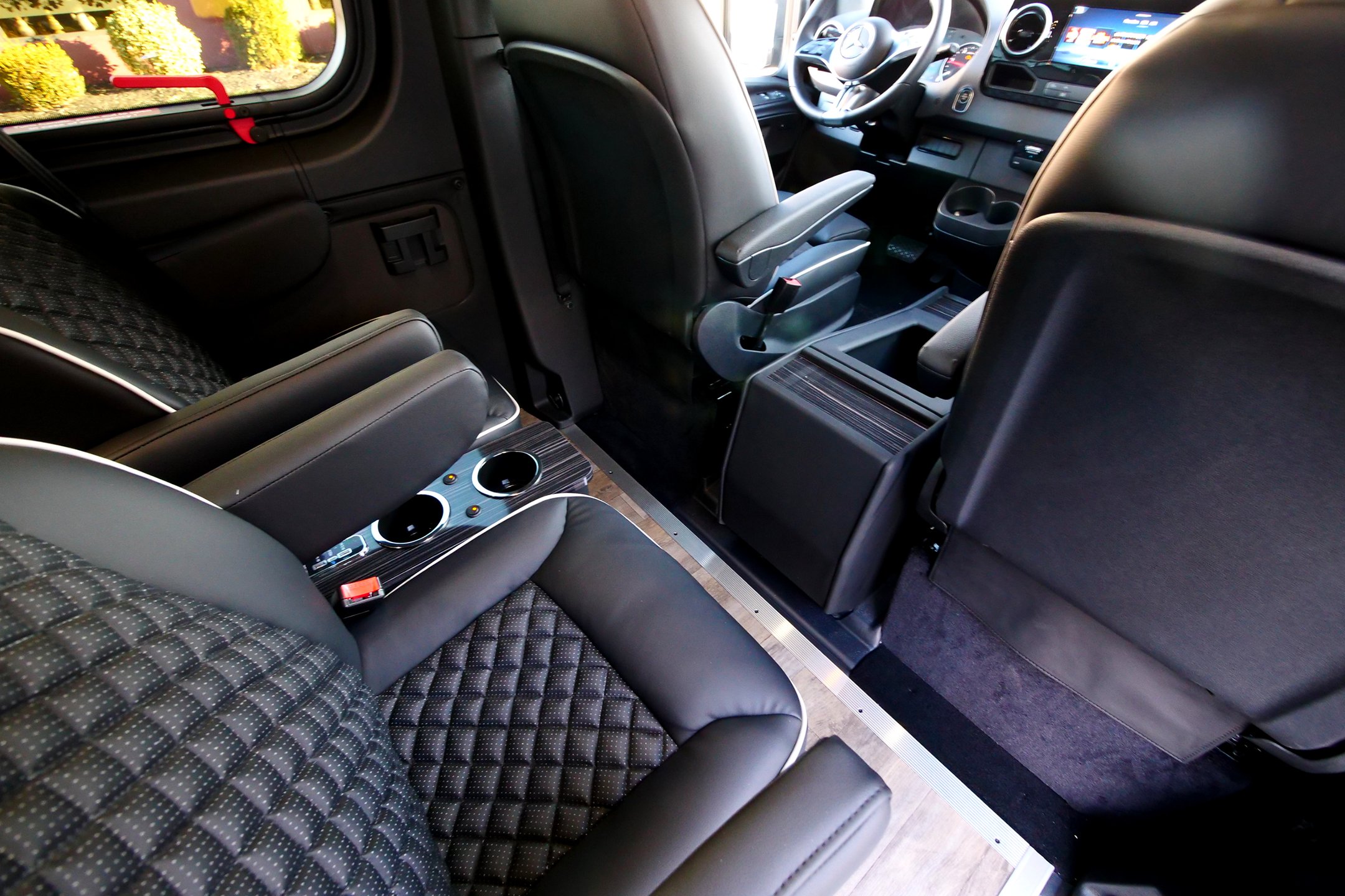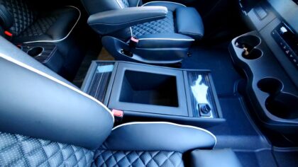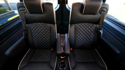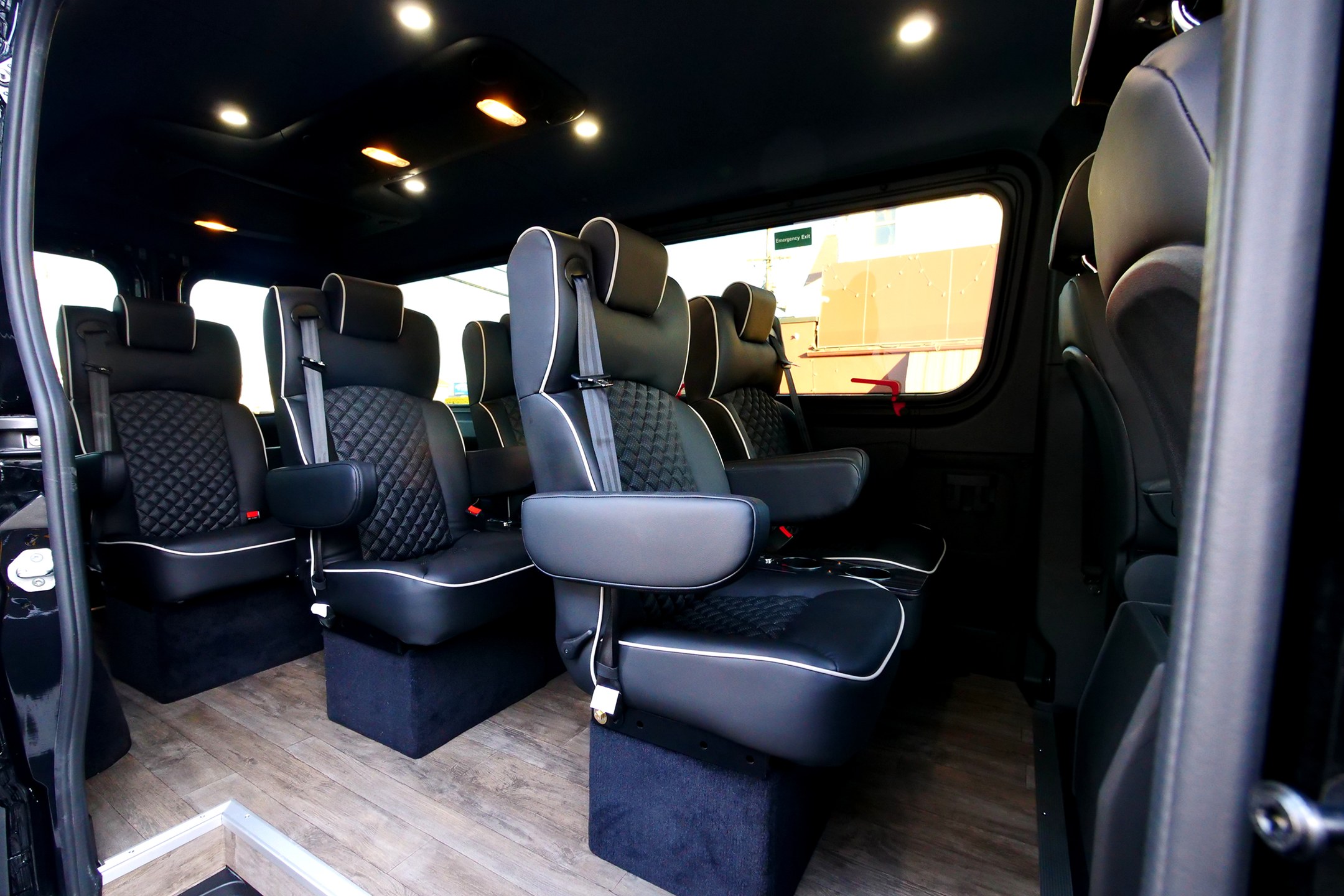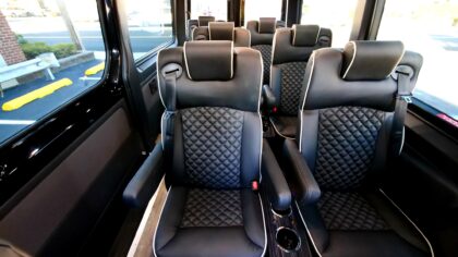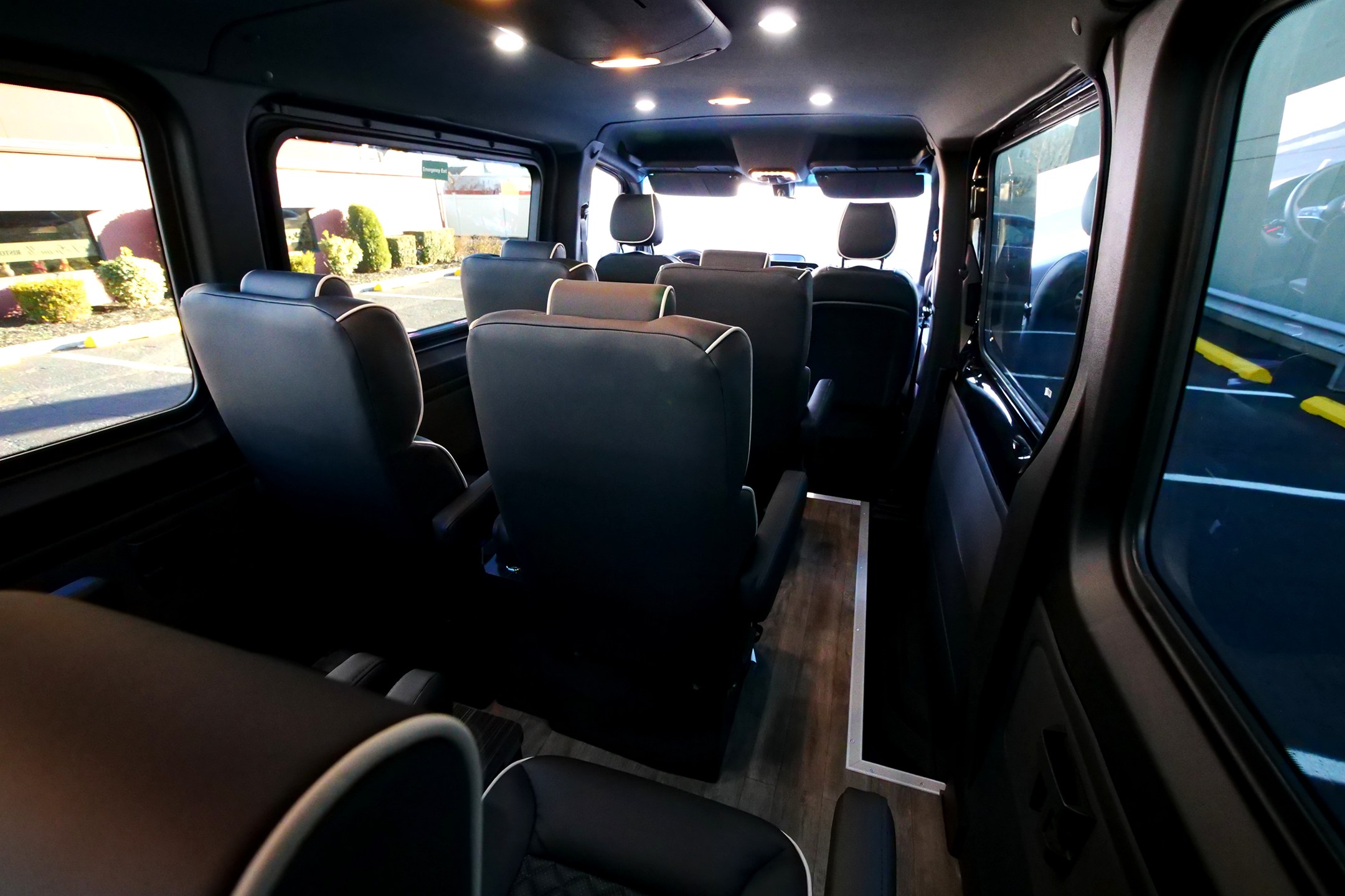 8-passenger mini luxury transport built on the Mercedes-Benz Sprinter 144″ chassis. Offering a refined alternative to traditional full-size SUVs with more shuttle space, comfort, and versatility. Built from the ground up, this van features eight spacious captain’s chairs each equipped with 3-point seat belts, center consoles, cupholders, lighting controls, and USB charging ports. Premium wood flooring and carefully selected finishes elevate the space, creating a quiet, comfortable, and upscale travel environment for any length commute.