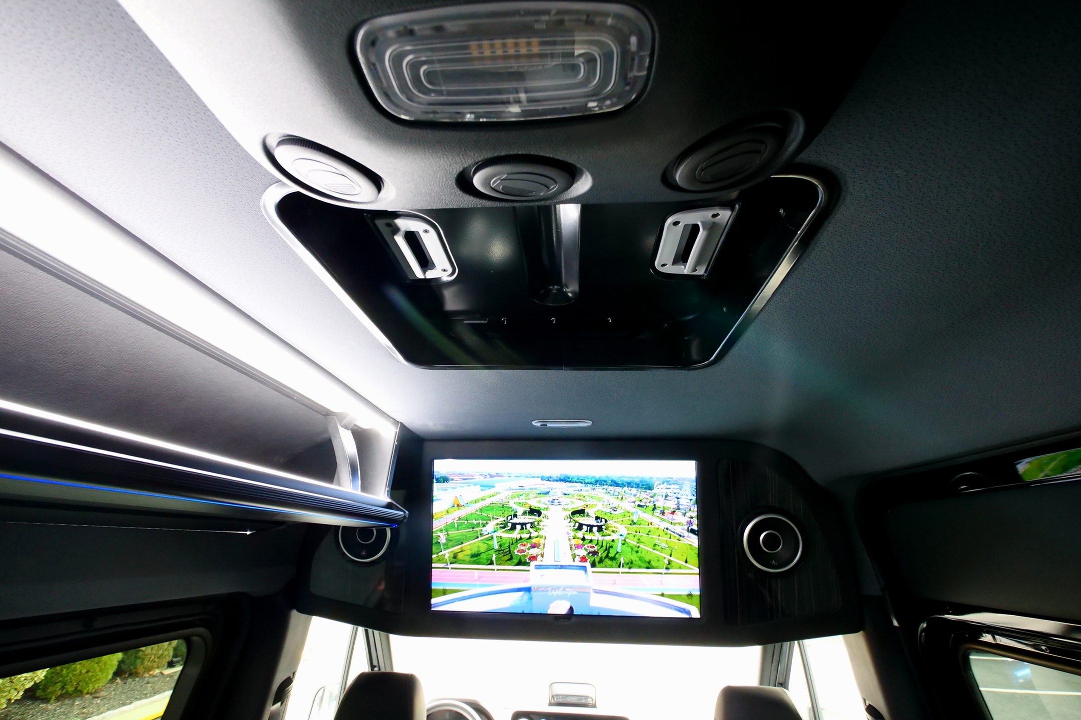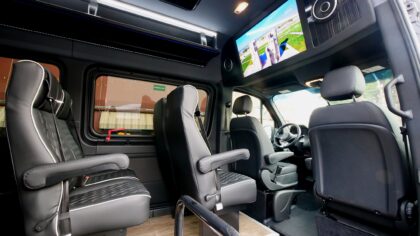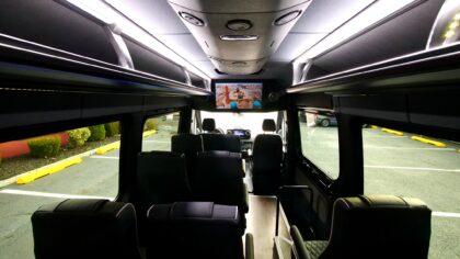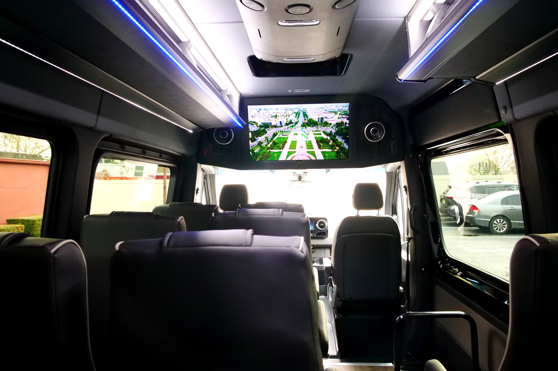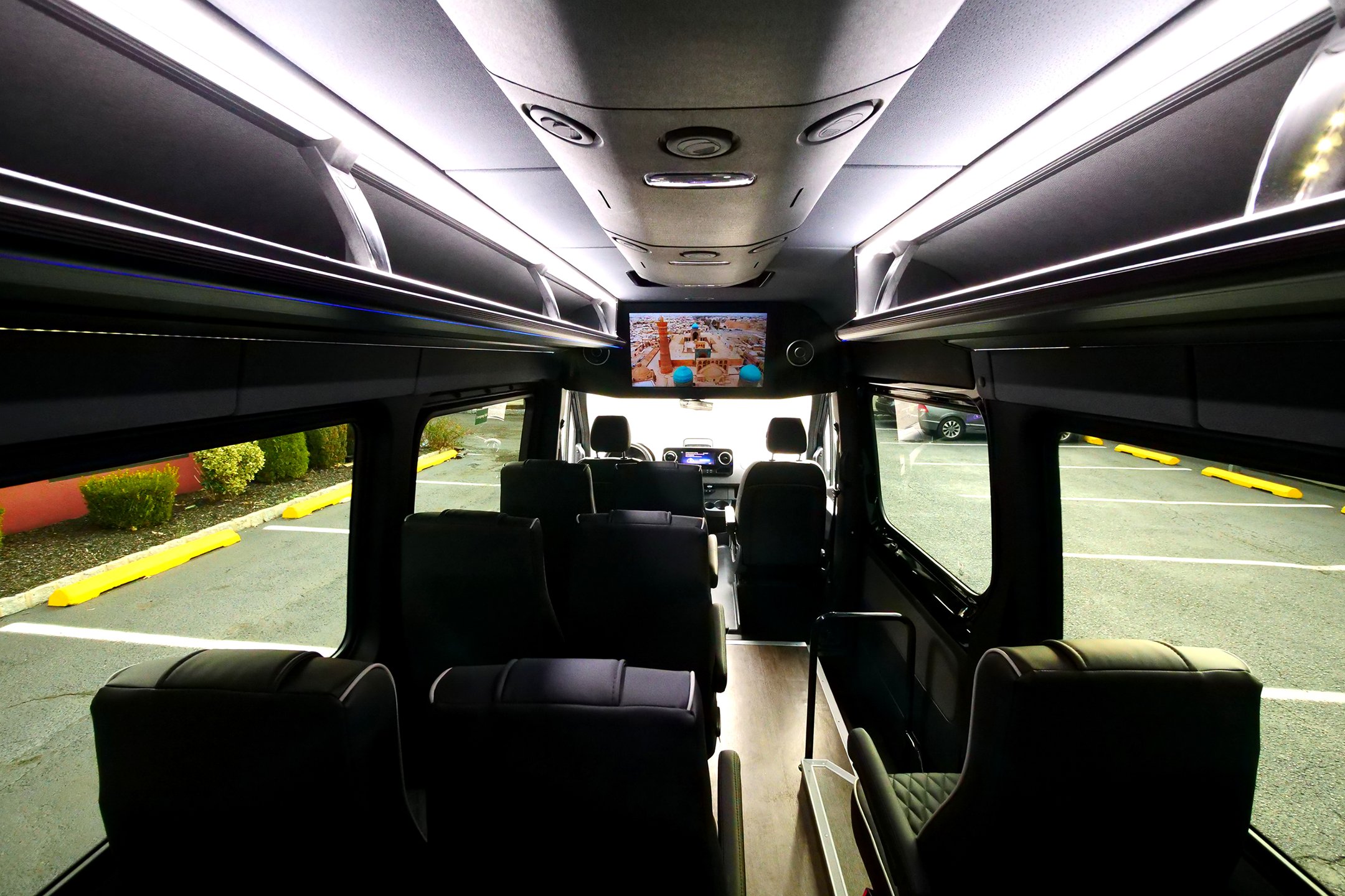 The interior features 13 plush leather reclining executive coach seats with 3-point seat belts, integrated armrests, adjustable backrests, and individual USB charging ports. Passenger amenities include a 32-inch overhead-mounted TV with surround sound, overhead luggage compartments, LED reading lights, and integrated A/C ducts throughout the cabin. Additional features include an emergency roof hatch, aluminum running boards for easy entry, and rear cargo storage for added convenience and safety.